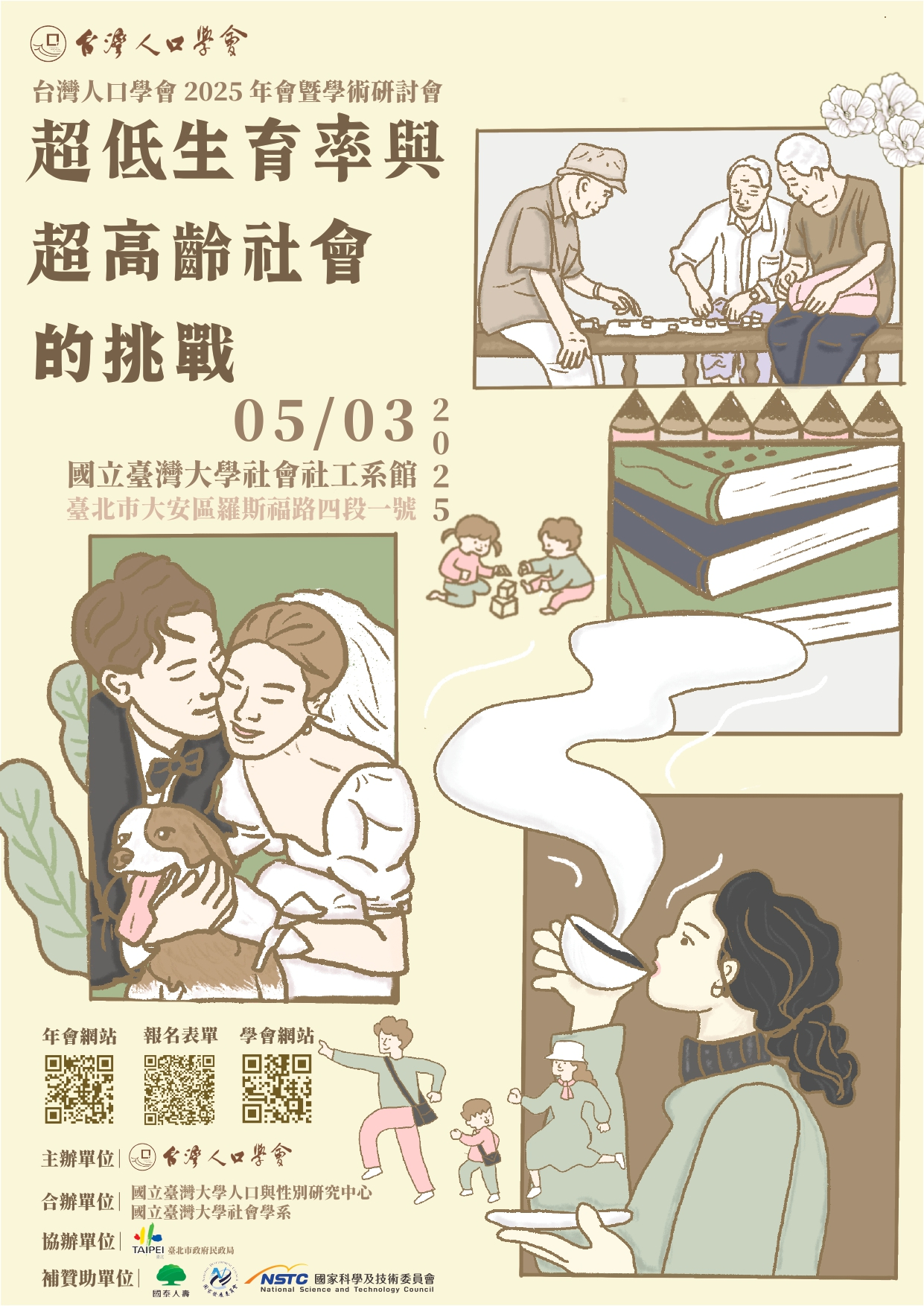 本會與台灣大學社會學系、人口與性別研究中心合辦的 2025 台灣人口學會年會暨「超低生育率與超高齡社會的挑戰」學術研討會,將於今 (2025) 年 5 月 3 日 (六),在台灣大學社會社工系館舉辦。即日起至 4 月 15 日,開放線上報名。